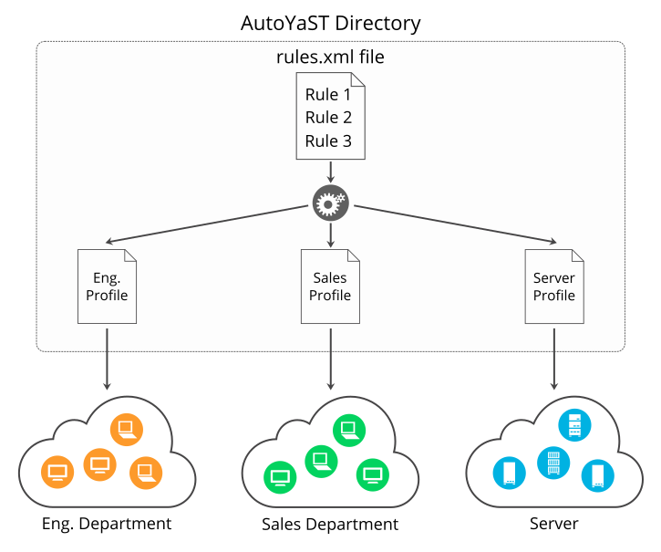 For example, this could be useful to install systems in two departments in one go. Assume a scenario where machines in department A need to be installed as office desktops, whereas machines in department B need to be installed as developer workstations. You would create a rules file with two different rules. For each rule, you could use different system parameters to distinguish the installations from one another. Each rule would also contain a link to an appropriate profile for each department.