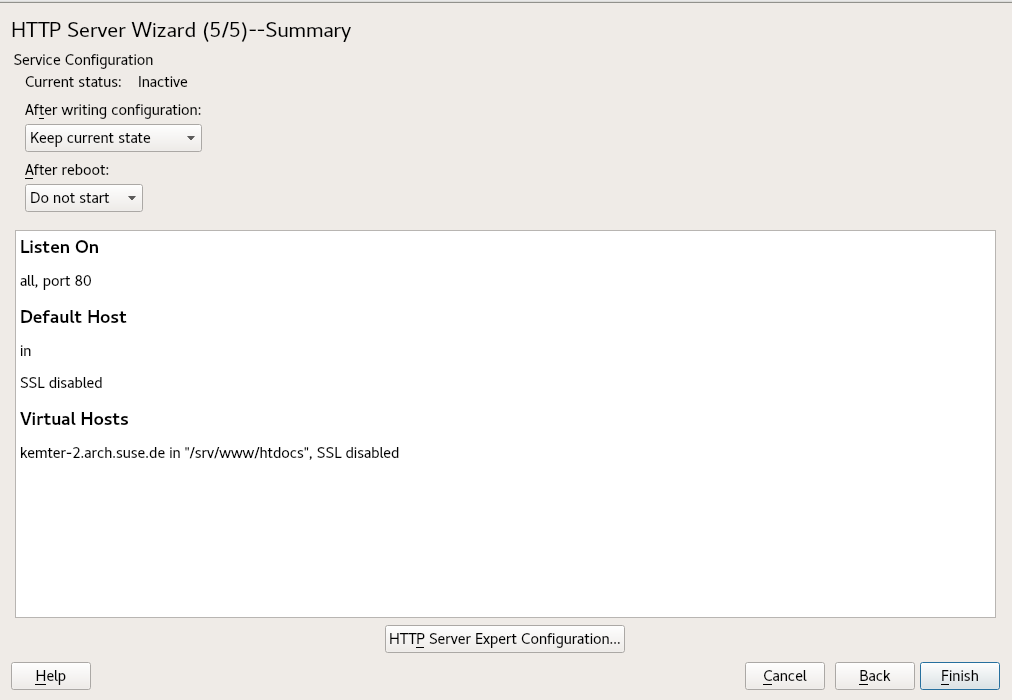 A common mistake is to not open the ports for Apache in the firewall configuration of the server. If you configure Apache with YaST, there is a separate option available to take care of this specific issue (see Section 24.2.3, “Configuring Apache with YaST”). If you are configuring Apache manually, open firewall ports for HTTP and HTTPS via YaST's firewall module.