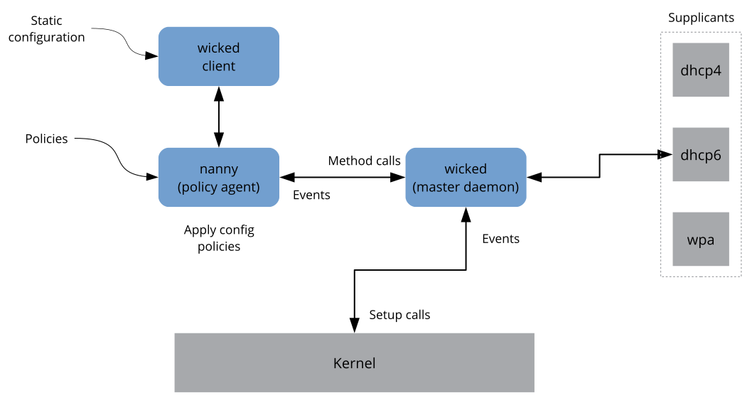 The following example configuration uses the Wicked network service that is used by default on openSUSE Leap. To learn more about Wicked, see Section 13.6, “Configuring a Network Connection Manually”.